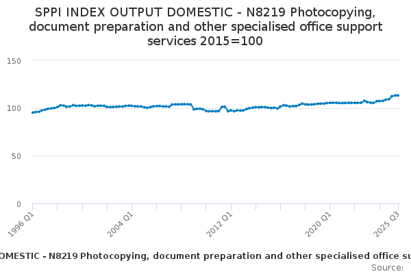 Download this time seriesSPPI INDEX OUTPUT DOMESTIC - N8219 Photocopying, document preparation and other specialised office support services 2015=100
