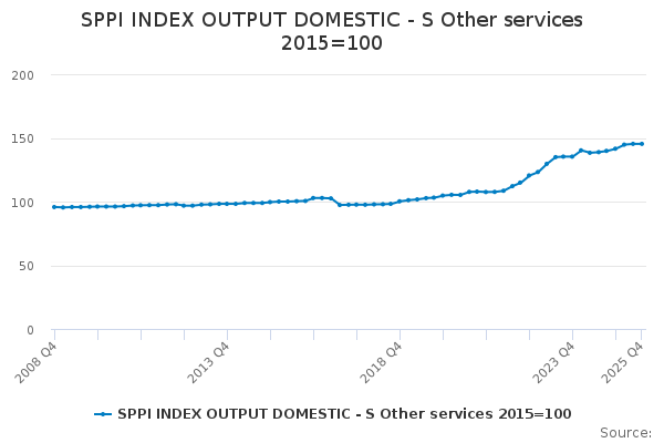 Download this time seriesSPPI INDEX OUTPUT DOMESTIC - S Other services 2015=100