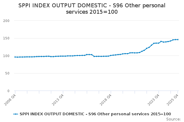 Download this time seriesSPPI INDEX OUTPUT DOMESTIC - S96 Other personal services 2015=100