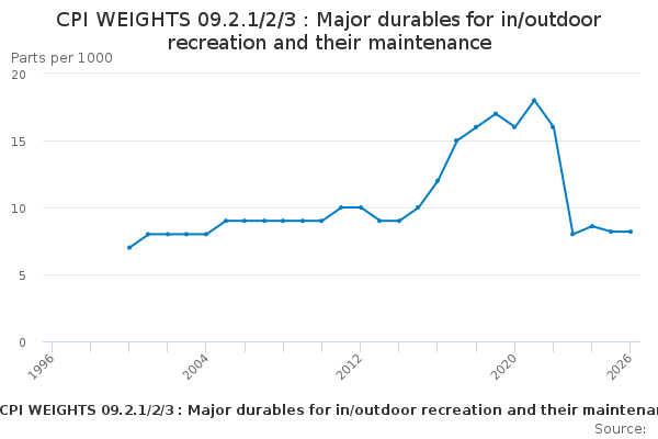 Download this time seriesCPI WEIGHTS 09.2.1/2/3 : Major durables for in/outdoor recreation and their maintenance