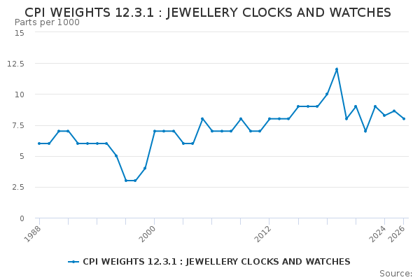 Download this time seriesCPI WEIGHTS 12.3.1 : JEWELLERY CLOCKS AND WATCHES
