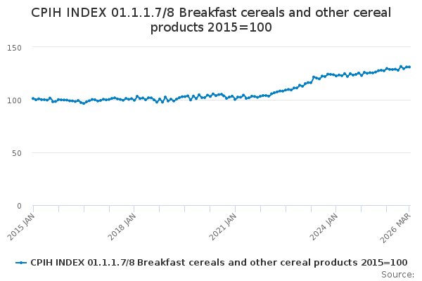 Download this time seriesCPIH INDEX 01.1.1.7/8 Breakfast cereals and other cereal products 2015=100