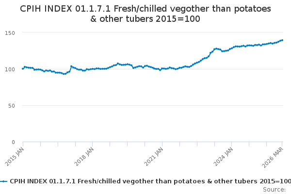 Download this time seriesCPIH INDEX 01.1.7.1 Fresh/chilled vegother than potatoes & other tubers 2015=100