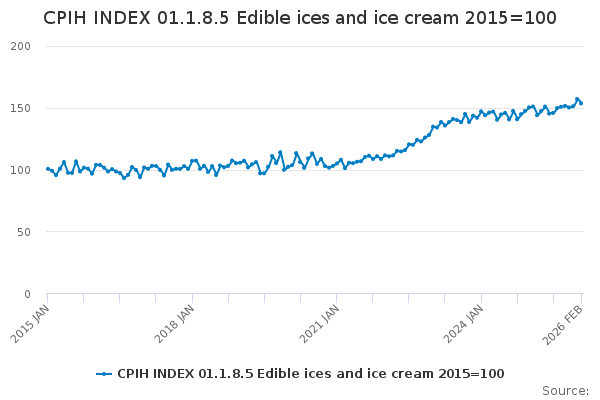 Download this time seriesCPIH INDEX 01.1.8.5 Edible ices and ice cream 2015=100