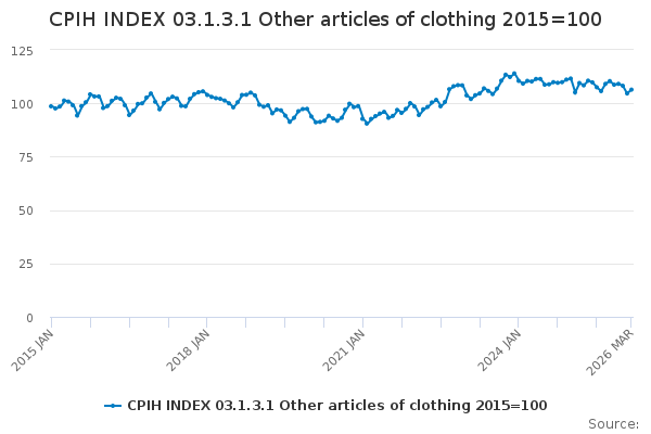 Download this time seriesCPIH INDEX 03.1.3.1 Other articles of clothing 2015=100