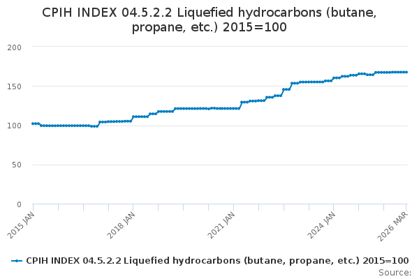 Download this time seriesCPIH INDEX 04.5.2.2 Liquefied hydrocarbons (butane, propane, etc.) 2015=100