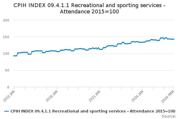 Download this time seriesCPIH INDEX 09.4.1.1 Recreational and sporting services - Attendance 2015=100
