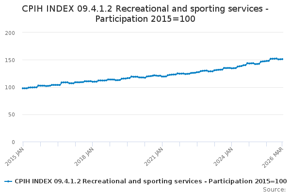 Download this time seriesCPIH INDEX 09.4.1.2 Recreational and sporting services - Participation 2015=100