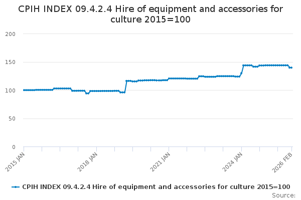 Download this time seriesCPIH INDEX 09.4.2.4 Hire of equipment and accessories for culture 2015=100