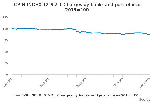 Download this time seriesCPIH INDEX 12.6.2.1 Charges by banks and post offices 2015=100