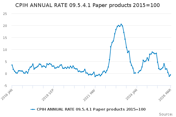 Download this time seriesCPIH ANNUAL RATE 09.5.4.1 Paper products 2015=100