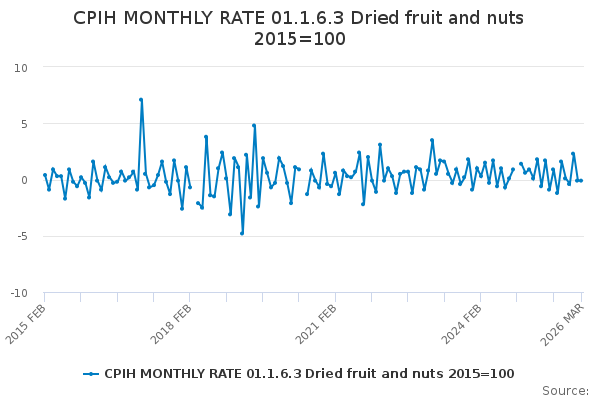 Download this time seriesCPIH MONTHLY RATE 01.1.6.3 Dried fruit and nuts 2015=100