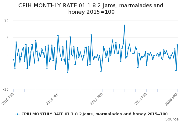 Download this time seriesCPIH MONTHLY RATE 01.1.8.2 Jams, marmalades and honey 2015=100
