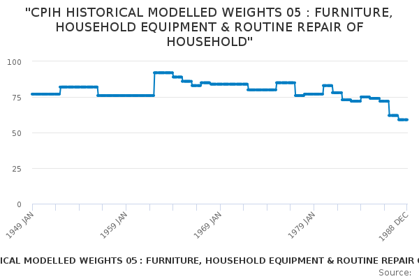 Download this time series"CPIH HISTORICAL MODELLED WEIGHTS 05 : FURNITURE, HOUSEHOLD EQUIPMENT & ROUTINE REPAIR OF HOUSEHOLD"