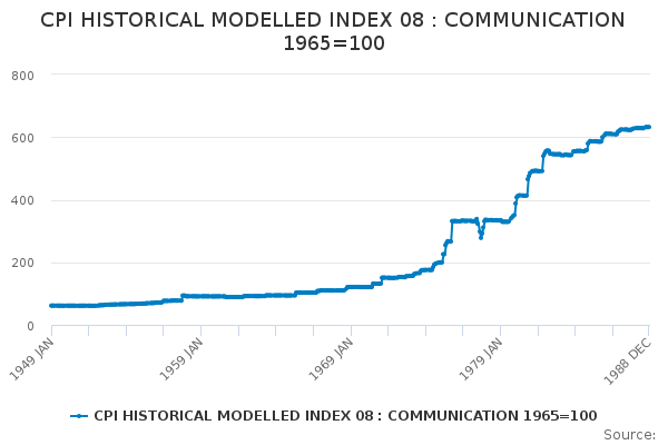 Download this time seriesCPI HISTORICAL MODELLED INDEX 08 : COMMUNICATION 1965=100