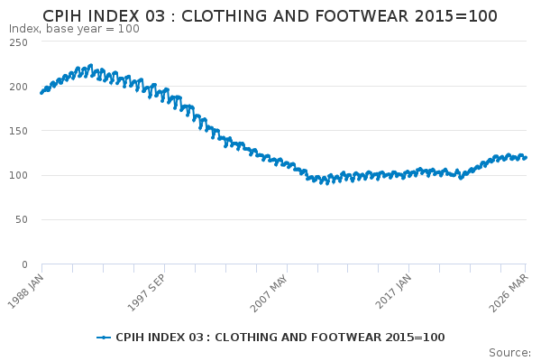 Download this time seriesCPIH INDEX 03 : CLOTHING AND FOOTWEAR 2015=100
