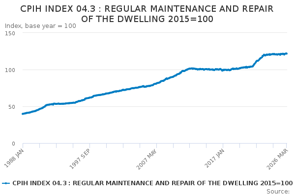 Download this time seriesCPIH INDEX 04.3 : REGULAR MAINTENANCE AND REPAIR OF THE DWELLING 2015=100