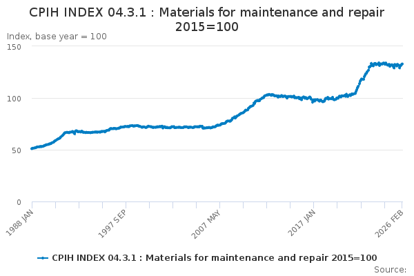 Download this time seriesCPIH INDEX 04.3.1 : Materials for maintenance and repair 2015=100