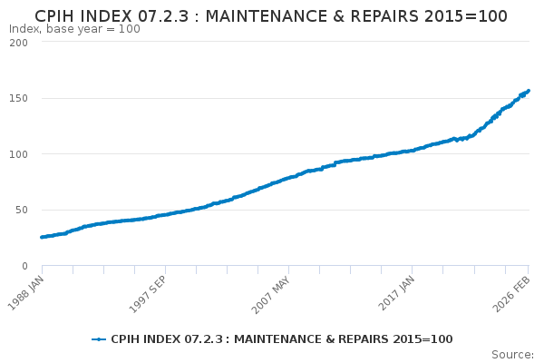 Download this time seriesCPIH INDEX 07.2.3 : MAINTENANCE & REPAIRS 2015=100