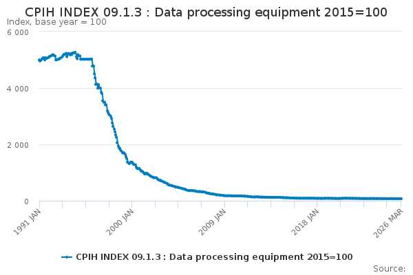 Download this time seriesCPIH INDEX 09.1.3 : Data processing equipment 2015=100