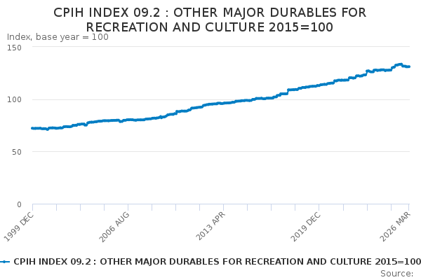 Download this time seriesCPIH INDEX 09.2 : OTHER MAJOR DURABLES FOR RECREATION AND CULTURE 2015=100
