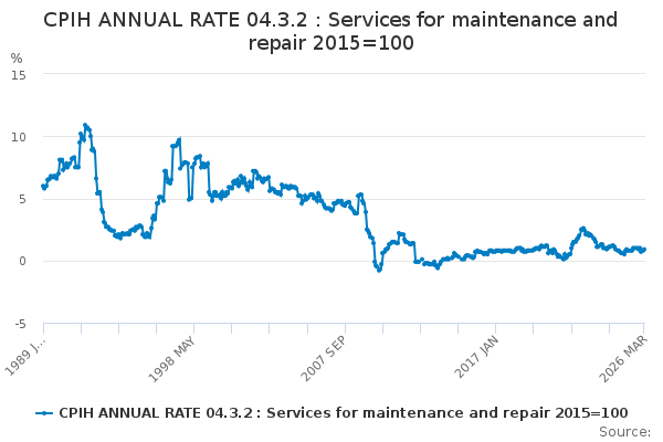 Download this time seriesCPIH ANNUAL RATE 04.3.2 : Services for maintenance and repair 2015=100