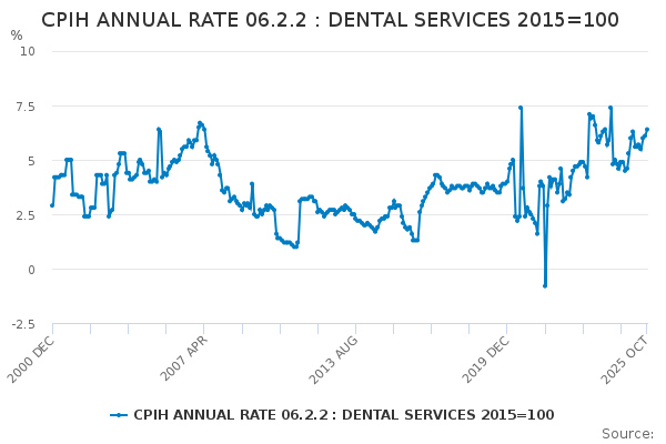 Download this time seriesCPIH ANNUAL RATE 06.2.2 : DENTAL SERVICES 2015=100