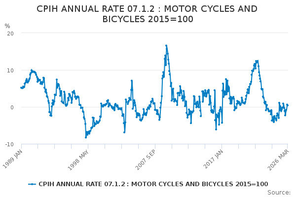 Download this time seriesCPIH ANNUAL RATE 07.1.2 : MOTOR CYCLES AND BICYCLES 2015=100