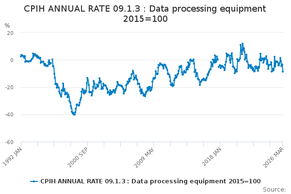 Download this time seriesCPIH ANNUAL RATE 09.1.3 : Data processing equipment 2015=100