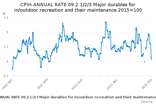 Download this time seriesCPIH ANNUAL RATE 09.2.1/2/3 Major durables for in/outdoor recreation and their maintenance 2015=100