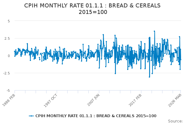 Download this time seriesCPIH MONTHLY RATE 01.1.1 : BREAD & CEREALS 2015=100