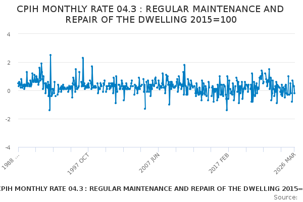 Download this time seriesCPIH MONTHLY RATE 04.3 : REGULAR MAINTENANCE AND REPAIR OF THE DWELLING 2015=100