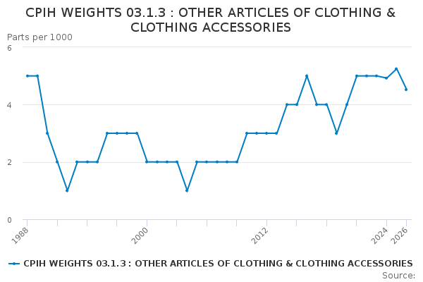 Download this time seriesCPIH WEIGHTS 03.1.3 : OTHER ARTICLES OF CLOTHING & CLOTHING ACCESSORIES