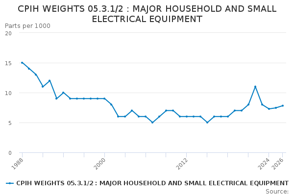 Download this time seriesCPIH WEIGHTS 05.3.1/2 : MAJOR HOUSEHOLD AND SMALL ELECTRICAL EQUIPMENT