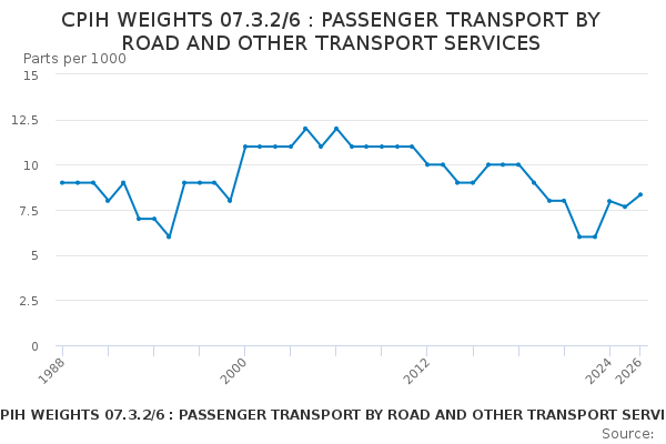 Download this time seriesCPIH WEIGHTS 07.3.2/6 : PASSENGER TRANSPORT BY ROAD AND OTHER TRANSPORT SERVICES