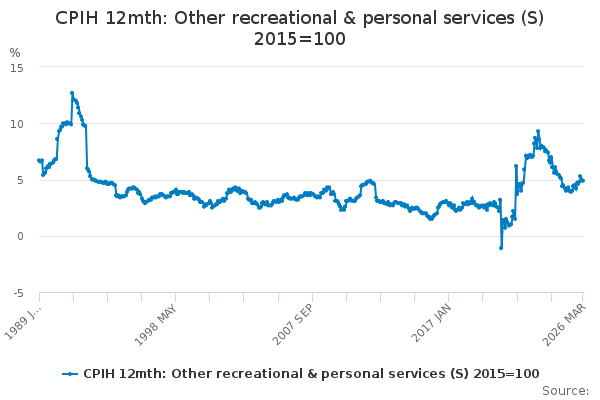 Download this time seriesCPIH 12mth: Other recreational & personal services (S) 2015=100