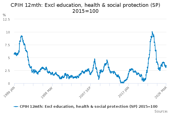 Download this time seriesCPIH 12mth: Excl education, health & social protection (SP) 2015=100