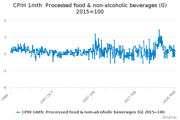 Download this time seriesCPIH 1mth: Processed food & non-alcoholic beverages (G) 2015=100
