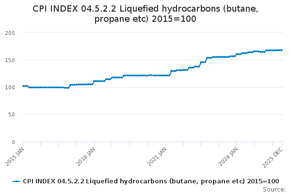 Download this time seriesCPI INDEX 04.5.2.2 Liquefied hydrocarbons (butane, propane etc) 2015=100