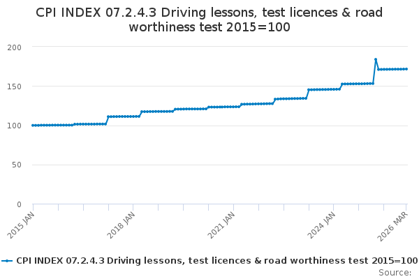 Download this time seriesCPI INDEX 07.2.4.3 Driving lessons, test licences & road worthiness test 2015=100