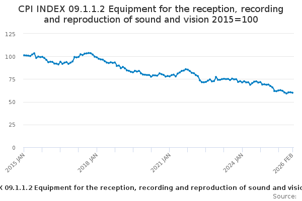Download this time seriesCPI INDEX 09.1.1.2 Equipment for the reception, recording and reproduction of sound and vision 2015=100
