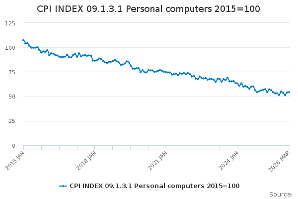 Download this time seriesCPI INDEX 09.1.3.1 Personal computers 2015=100