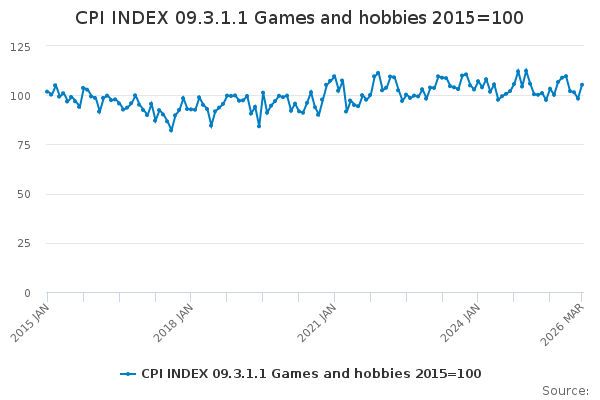 Download this time seriesCPI INDEX 09.3.1.1 Games and hobbies 2015=100