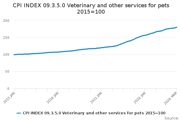 Download this time seriesCPI INDEX 09.3.5.0 Veterinary and other services for pets 2015=100