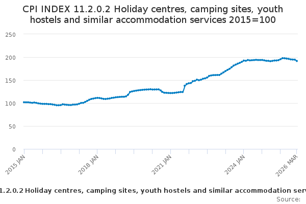 Download this time seriesCPI INDEX 11.2.0.2 Holiday centres, camping sites, youth hostels and similar accommodation services 2015=100