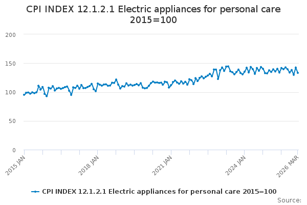 Download this time seriesCPI INDEX 12.1.2.1 Electric appliances for personal care 2015=100