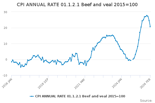 Download this time seriesCPI ANNUAL RATE 01.1.2.1 Beef and veal 2015=100