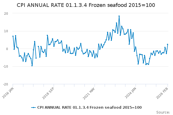 Download this time seriesCPI ANNUAL RATE 01.1.3.4 Frozen seafood 2015=100