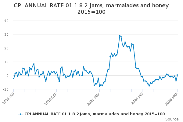 Download this time seriesCPI ANNUAL RATE 01.1.8.2 Jams, marmalades and honey 2015=100