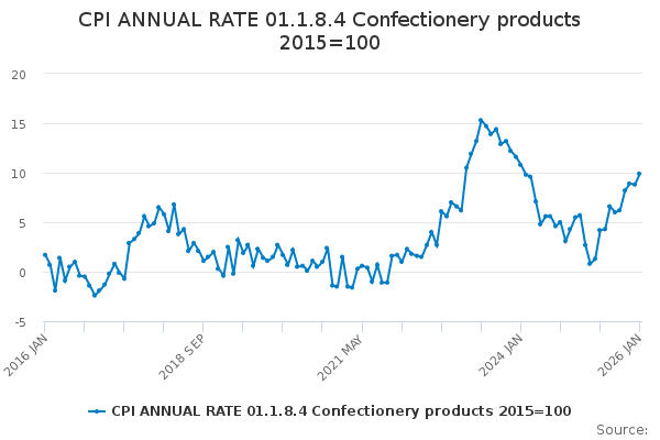Download this time seriesCPI ANNUAL RATE 01.1.8.4 Confectionery products 2015=100